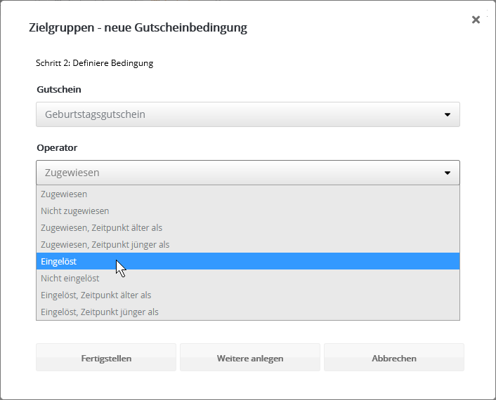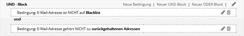 Insbesondere nach dem Kopieren einer vorhandenen Zielgruppe kann das sinnvoll sein, wenn die identischen Abonnenten in Original und Kopie nicht gewünscht sind. Bedingung anhand GutscheinFiltern Sie Abonnenten danach, ob und in welchem Zeitraum die Zuweisung oder Einlösung eines Gutscheins stattfand. Tipp: Um zugewiesene Gutscheine als eingelöst zu markieren, nutzen Sie entweder die Webservice-Funktion 'RedeemVoucherByCode' oder importieren in der Gutscheinübersicht eine CSV-Datei mit den eingelösten Gutscheincodes. Bedingung anhand SelektionMit diesem Bedingungstyp nutzen Sie eine per Webservice angelegte Selektion von Abonnenten als buntebrause agentur-Zielgruppe. Der Bedingungstyp ist nur dann sichtbar, wenn per Webservice mindestens eine Selektion angelegt wurde. Das Besondere: In einer Selektion werden Abonnenten anhand einer Liste von IDs gruppiert. So lässt sich eine extern getroffene Abonnentenauswahl als Zielgruppe nutzen, ohne dass in den buntebrause agentur-Abonnentendaten ein gemeinsames Merkmal vorliegen muss. Die Details entnehmen Sie bitte der Webservice-Dokumentation, die wir Ihnen gern zusenden. Bedingung anhand des Empfängers (geplant)Diese Bedingung entscheidet, ob ein Abonnent als Empfänger eines bestimmten Mailings vorgesehen war oder nicht. Das bedeutet, dass er in einer Abonnentenliste bzw. Zielgruppe für ein bestimmtes Mailing steht, welches versandt wurde. Im Unterschied zur letztgenannten Bedingung wird der tatsächliche Empfang jedoch nicht geprüft. Es sind auch alle Empfänger enthalten, die das Mailing z. B. aufgrund von Bounces, Blacklists oder serversseitigen Spamfiltern nicht empfangen haben. Bedingung anhand des Empfangens (zugestellt)Diese Bedingung entscheidet, ob jemand ein bestimmtes Mailing empfangen hat oder nicht. Das Mailing gilt als empfangen, wenn der E-Mail-Server des Abonnenten eine positive Rückmeldung erteilt hat. Im Schritt nach dem Empfang ist es dennoch möglich, dass das Mailing beim Empfänger in einem Spamordner landet. Bedingung anhand des BounceverhaltensDamit legen Sie Bedingungen anhand der Zustellungen oder Nichtzustellungen eines bestimmten Mailings an. Bedingung anhand Blacklist bzw. Zurückgehaltener AdressenAbonnenten, deren E-Mail-Adresse auf einer Blacklist oder der Liste der zurückgehaltenen Adressen steht, werden automatisch vom Versand ausgeschlossen. Dieselben* Abonnenten lassen sich per Zielgruppe filtern, etwa um sie beim Export Ihrer Abonnentendaten ebenfalls auszuschließen. Die kombinierte Zielgruppe sieht wie folgt aus:
