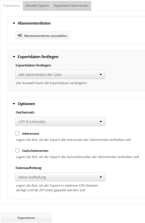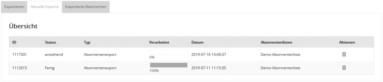 Durch Klick auf die Schaltfläche 'Exportieren' startet buntebrause agentur den Export und wechselt zu 'Aktuelle Exporte'. Hier sehen Sie den Fortschritt des aktuellen Exports. Dem Verlaufsbalken sowie dem jeweils angezeigten Status entnehmen Sie, wann der Export erfolgreich abgeschlossen ist. Im Reiter 'Exportierte Abonnenten' finden sie die Export-Datei, die Sie nach einem Klick auf 'Download' auf Ihrem Computer speichern können.