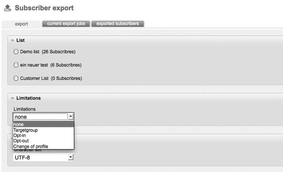 Subscribers lists can be exported from buntebrause agentur as CSV – files. An advantage, for example, is that you can back up the address lists in this way. In the tab 'Export’, you can make choices of the lists that have to be exported. Per export only one subscriber list can be chosen. If you only want to export certain data records, you can decide on 'Limitations’. |