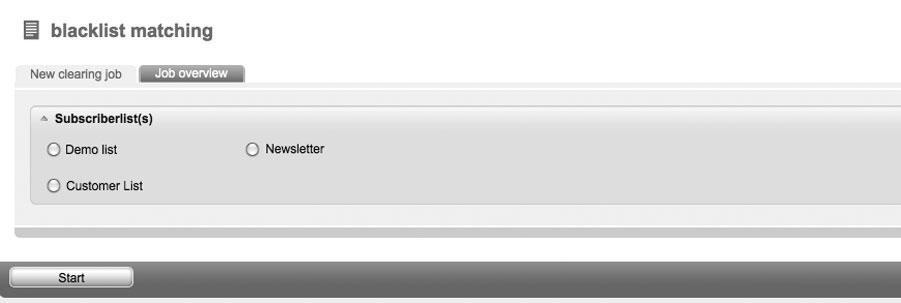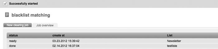 | You will find information on the blacklist and its function in 2.11 Blacklist. Via the function 'Blacklist matching', you can coordinate the data records of your subscriber lists with the entries in your blacklist. Detected subscribers will automatically be deleted by buntebrause agentur. First, you have got to choose the subscriber list which has to be examined. By clicking the 'OK' button, you will confirm the appearing message to delete the search results. The result will show you how many subscribers were removed due to the fact that they are registered in the blacklist. |
