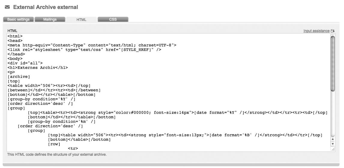While creating your external archive, buntebrause agentur generates an html source code in the background, which defines the structure of your external archive. If you want to edit the look of your shown archive, you have to edit the source code, which requires appropiate HTML knowledge.
