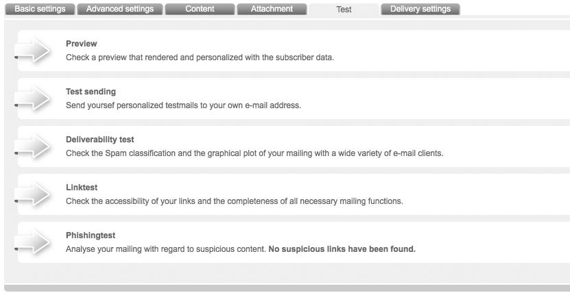 Having finished your newsletter, buntebrause agentur offers you numerous testing possibilities. This helps you to optimize your mailing and achieve maximum success before actual dispatch. You can get to the testing functions by choosing the tab 'Test' in the menu in which you edit your mailing. Following tests are available: |
