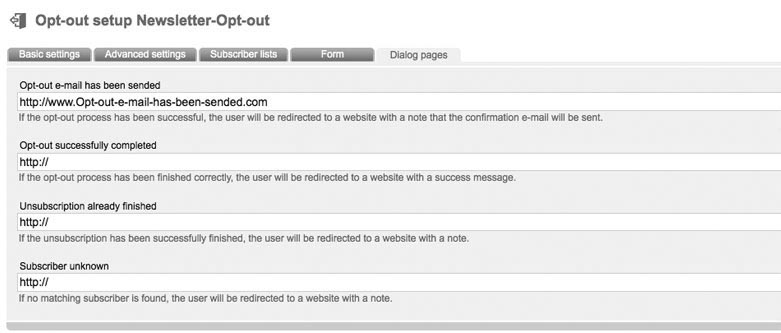 Enter a name and an optional description. Choose the 'mode' (important). The following modes are supported by 'buntebrause agentur': Double-optout with confirmation e-mail: after unsubscribe from your website or your newsletter a confirmation email will be send automatically. Optout will be activated after clicking the confirmation link in this email. After successful unsubscription the former subscriber will get a last email („You unsubscribed successfully of our newsletter.“) Double Optout: Like described before, but without sending of a „successful unsubscription“ e-mail Confirmed Opt-Out (recommended): After unsubsubscription on your website or in your newsletter a „successful unsubscription“ email will be sended immediately. Single Optout: No e-mails will be send. There just will be a message in your browser, that optout was successfull. In Tab 'advanced settings' you can deposit your e-mail address in field 'e-mail forwarding', to be informed about unsubscriptions. Tab 'subscriberlists': Choose your favorite subscriberlist(s), where all unsubscriptions should be logged out. Select the subscriberfields, which should be filled out by your subscribers in tab 'Form'. After clicking 'create form fields' a popup appears, where you can choose and add subscriber fields to your form. Click 'sort formular fields' to arrange your fields. Click 'test form' to open a new tab in your browser with a preview of your form. Source Code of your website is genereated by 'buntebrause agentur' by clicking 'Formular soruce code'. A popup appears with your source code. Last tab: Dialog pages |