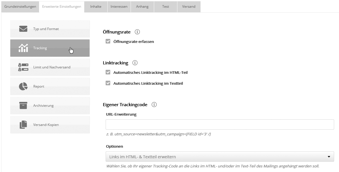 ÖffnungsrateUm nach dem Versand auszuwerten, wieviel Prozent der Empfänger das Mailing geöffnet haben (siehe 'Übersicht, Öffnungs-/Klickrate'), muss die Option 'Öffnungsrate erfassen' aktiviert sein. Dazu integriert buntebrause agentur im HTML-Teil des Mailings ein unsichtbares Zählpixel, welches für jeden Empfänger individuell verlinkt ist und dessen Aufruf als Öffnung gezählt wird. Die Messung funktioniert unabhängig von der Mailing-Einstellung 'Inboundimages', solange der Empfänger die Anzeige von Bildern in seinem Posteingang nicht unterdrückt. Hinweis: Ist die Erfassung der Öffnungsrate deaktiviert, aber die nachfolgende Option "Linktracking" aktiviert, dann werden Klicks automatisch auch als Öffnung gewertet. Die Öffnungsrate erfasst in dem Fall nur den Teil der Öffner, der irgendeinen Link angeklickt hat. LinktrackingAktivieren Sie Automatisches Linktracking im HTML-Teil, so wird jeder im Mailing enthaltene Link durch einen Tracking-Link ersetzt, der für jeden Abonnenten individualisiert ist. Diese Tracking-Links werden über den buntebrause agentur-Server auf die ursprüngliche Link-URL umgeleitet und dabei gezählt. Damit können Sie nach Versand des Mailings sehen, wie oft jeder Link angeklickt wurde (siehe 'Übersicht, Öffnungs-/Klickrate'). Weiterhin lassen sich darauf basierend Zielgruppen bilden, z. B. "Alle, die Link B angeklickt haben" können erneut mit weiteren Informationen angeschrieben werden. Bitte beachten Sie, dass Sie jede URL vorher als Link definieren müssen. Sie können die Richtigkeit der Tracking-Links überprüfen, indem Sie sich ein Testmailing zusenden. Eigener Tracking-CodeHier ist es möglich, alle Links des Mailings automatisch um eigene Parameter zu erweitern. Damit lässt sich das weitere Verhalten der Newsletterempfänger per Website-Analyse-Tools wie z.B. Google Analytics, Piwik oder econda tracken. Kopieren Sie dazu den Tracking Code Ihres Tools in das Feld, damit buntebrause agentur ihn automatisch an alle externen Links Ihres Mailings anhängt. Folgende Parameter werden unterstützt: