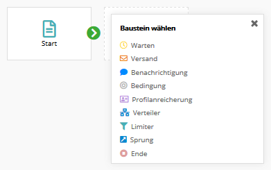 Der Startbaustein steht am Anfang jeder Kampagne. Er entscheidet, welche Abonnenten die Kampagne betreten (Bedingung trifft zu) und später wieder verlassen (Bedingung trifft nicht mehr zu).