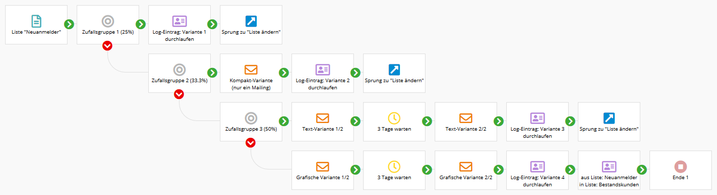 - Die übrigen rund 75% erfüllen die Bedingung nicht und folgen dem roten Pfeil zum Bedingungsbaustein der 'Zufalls-Gruppe 2'. Da hier nur 75% statt 100% der ursprünglichen Abonnenten ankommen, muss der Bedingungsbaustein für Gruppe 2 auf 1/3 bzw. 33.3% filtern, um ungefähr dieselbe Gruppengröße zu erreichen (3/4 * 1/3 = 1/4).