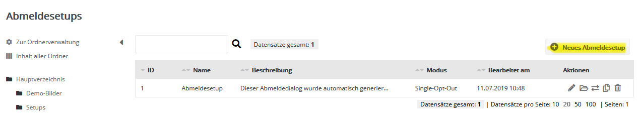 Ablauf einer AbmeldungKlickt der Empfänger den Abmeldelink an, wird ein in buntebrause agentur eingerichtetes 'Abmeldesetup' angestoßen und der Abonnent vom Newsletter-Empfang abgemeldet. Das kann je nach Einstellung entweder sofort oder nach nochmaliger Bestätigung (Double-Opt-Out, nicht empfehlenswert) passieren. In den Eigenschaften eines Abmeldesetups wählen Sie die Bestätigungsnachricht aus und optional die Abonnentenlisten, aus denen der Abonnent entfernt werden soll. Ist der Abonnent aufgrund der Abmeldung in keiner einzigen Abonnentenliste mehr enthalten, wird er auch aus der 'Abonnentenverwaltung' entfernt. Neues Abmeldesetup erstellen |
