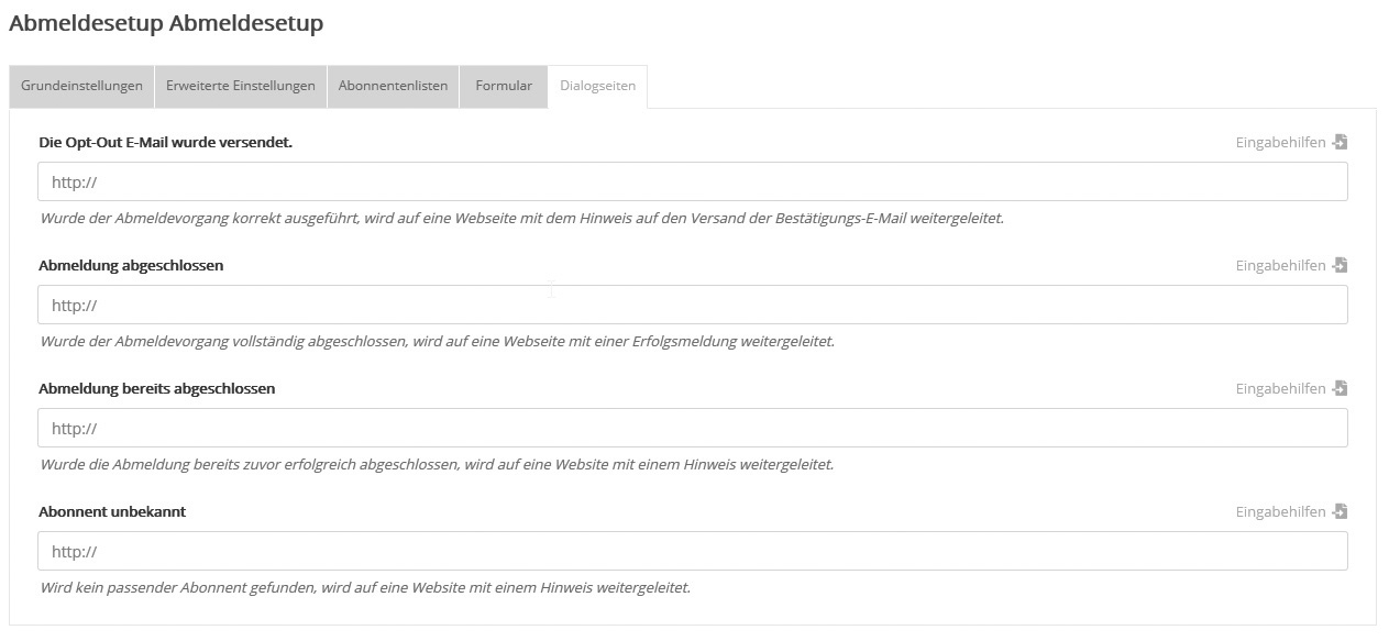 Zur Erklärung: Ein Abonnent wird nach erfolgreicher beziehungsweise fehlerhafter Eingabe seiner Daten zu einer entsprechenden Antwort-Seite geleitet, um zum Beispiel die Meldung 'Ihre Anmeldung war erfolgreich' zu erhalten. Füllen Sie diese Felder nicht aus, werden Standard-Seiten von buntebrause agentur verwendet. Möchten Sie aber eigene Seiten anzeigen lassen, geben Sie die URLs Ihrer Webseiten in den Feldern an. Alternativ bietet buntebrause agentur die Erstellung von Dialogseiten auf Basis Ihres Corporate Designs an. |
